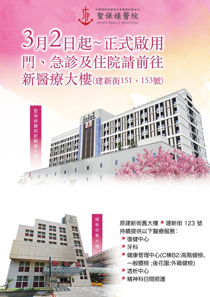 聖保祿醫院新醫療大樓服務地點公告 自3月2日起門、急、住院醫療等服務,新醫療大樓地點: 桃園市桃園區建新街 151、153 號(陽明公園籃球場對面) 聖保祿醫院為桃園市桃園區歷史最悠久之區域教學醫院,亦為本區第一所天主教醫院。我們未來仍將秉持「醫療傳愛」之精神,以專業與關懷守護每一位病人及家庭的健康與平安。敬請民眾持續支持與指教
