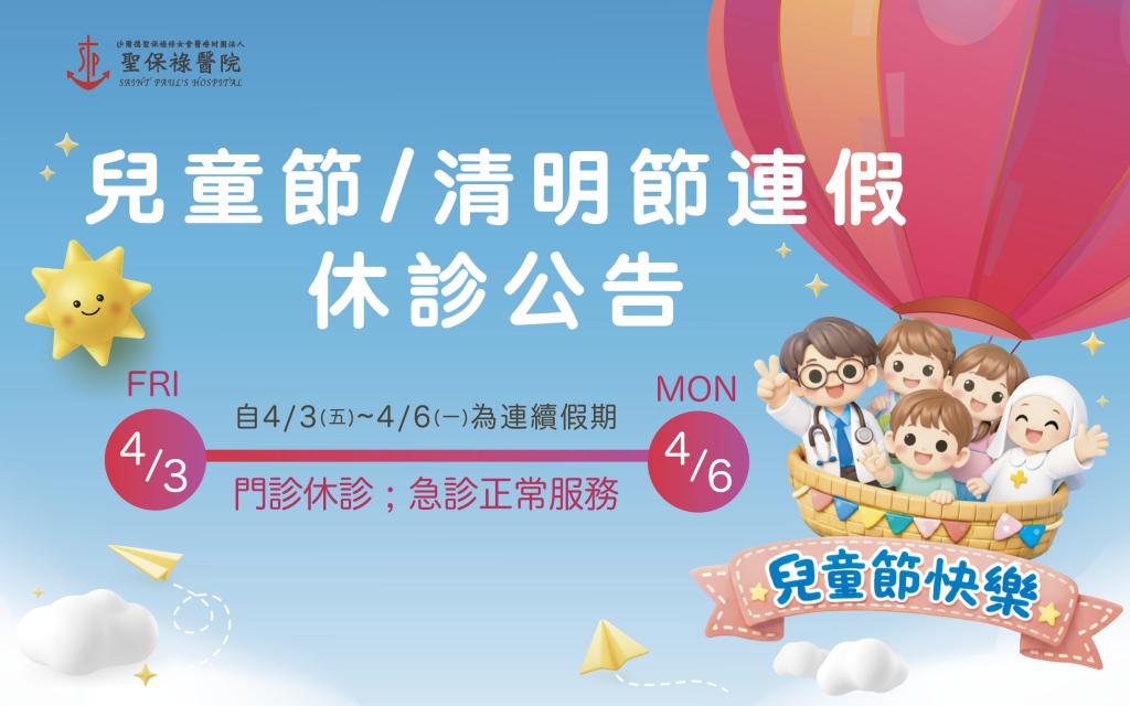 適逢兒童節/清明節連續假期,本院門診服務將進行調整,敬請留意就醫時間。